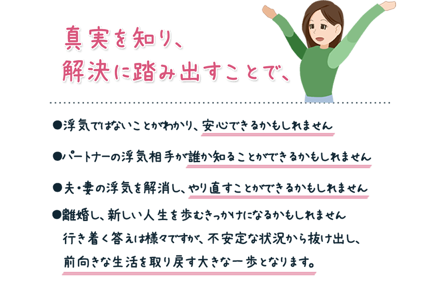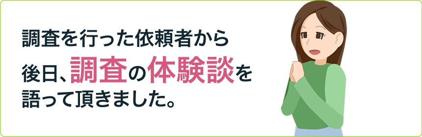 調査の進行状況・経過は、必要に応じてご依頼者様にご報告し、ご確認頂きながら調査を進めます。そのため、ご依頼者様のご承諾のない追加調査は発生致しませんのでご安心ください。