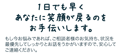 お電話(フリーダイヤル)、メールにてご相談をお伺い致します(24時間無料受付)。ご相談者様の立場になり、専門の相談員が丁寧にお応え致します。