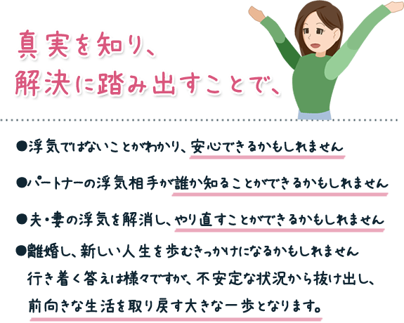 数多くの経験をもとにケースに応じた適切なアドバイスが可能です。当探偵社は、調査を熟知した相談員が対応し、調査を進めるばかりの営業スタッフではありません。